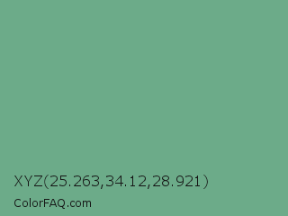 XYZ 25.263,34.12,28.921 Color is a normal green color and the nearest color is Silver Tree #66b58f. Hex code #6cab89 and RGB value is rgb(108,171,137). In RGB color space, this color is composed of 42% red, 67% green, 54% blue, In CMYK color space, this color is composed of 37% cyan, 0% magenta, 20% yellow , 33% black , In HSL color space, this color has a hue angle of 148° , 27% saturation and 55% lightness.