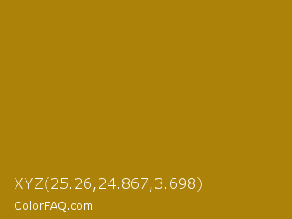 XYZ 25.26,24.867,3.698 Color is a normal orange color and the nearest color is Hot Toddy #b38007. Hex code #ad8208 and RGB value is rgb(173,130,8). In RGB color space, this color is composed of 68% red, 51% green, 3% blue, In CMYK color space, this color is composed of 0% cyan, 25% magenta, 95% yellow , 32% black , In HSL color space, this color has a hue angle of 44° , 91% saturation and 35% lightness.