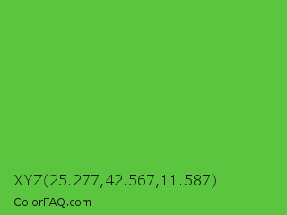 XYZ 25.277,42.567,11.587 Color is a normal green color and the nearest color is Green RYB #66b032. Hex code #5cc53f and RGB value is rgb(92,197,63). In RGB color space, this color is composed of 36% red, 77% green, 25% blue, In CMYK color space, this color is composed of 53% cyan, 0% magenta, 68% yellow , 23% black , In HSL color space, this color has a hue angle of 107° , 54% saturation and 51% lightness.