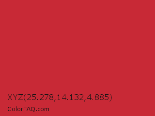 XYZ 25.278,14.132,4.885 Color is a normal red color and the nearest color is Madder Lake #cc3336. Hex code #c82936 and RGB value is rgb(200,41,54). In RGB color space, this color is composed of 78% red, 16% green, 21% blue, In CMYK color space, this color is composed of 0% cyan, 80% magenta, 73% yellow , 22% black , In HSL color space, this color has a hue angle of 355° , 66% saturation and 47% lightness.