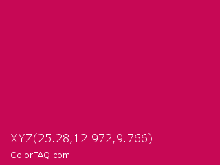 XYZ 25.28,12.972,9.766 Color is a normal rose color and the nearest color is Pictorial Carmine #c30b4e. Hex code #c70855 and RGB value is rgb(199,8,85). In RGB color space, this color is composed of 78% red, 3% green, 33% blue, In CMYK color space, this color is composed of 0% cyan, 96% magenta, 57% yellow , 22% black , In HSL color space, this color has a hue angle of 336° , 92% saturation and 41% lightness.