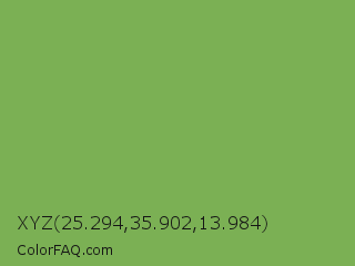 XYZ 25.294,35.902,13.984 Color is a normal green color and the nearest color is Chelsea Cucumber #83aa5d. Hex code #7bb054 and RGB value is rgb(123,176,84). In RGB color space, this color is composed of 48% red, 69% green, 33% blue, In CMYK color space, this color is composed of 30% cyan, 0% magenta, 52% yellow , 31% black , In HSL color space, this color has a hue angle of 95° , 37% saturation and 51% lightness.