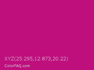 XYZ 25.295,12.873,20.22 Color is a normal magenta color and the nearest color is Red Violet #c71585. Hex code #bf0f7c and RGB value is rgb(191,15,124). In RGB color space, this color is composed of 75% red, 6% green, 49% blue, In CMYK color space, this color is composed of 0% cyan, 92% magenta, 35% yellow , 25% black , In HSL color space, this color has a hue angle of 323° , 85% saturation and 40% lightness.