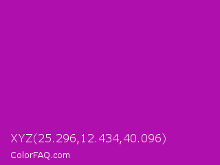 XYZ 25.296,12.434,40.096 Color is a normal magenta color and the nearest color is Heliotrope Magenta #aa00bb. Hex code #af0fac and RGB value is rgb(175,15,172). In RGB color space, this color is composed of 69% red, 6% green, 67% blue, In CMYK color space, this color is composed of 0% cyan, 91% magenta, 2% yellow , 31% black , In HSL color space, this color has a hue angle of 301° , 84% saturation and 37% lightness.
