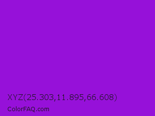 XYZ 25.303,11.895,66.608 Color is a normal purple color and the nearest color is Dark Violet #9400d3. Hex code #9611d9 and RGB value is rgb(150,17,217). In RGB color space, this color is composed of 59% red, 7% green, 85% blue, In CMYK color space, this color is composed of 31% cyan, 92% magenta, 0% yellow , 15% black , In HSL color space, this color has a hue angle of 280° , 85% saturation and 46% lightness.