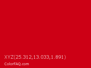 XYZ 25.312,13.033,1.891 Color is a normal red color and the nearest color is Harvard Crimson #c90016. Hex code #cd0015 and RGB value is rgb(205,0,21). In RGB color space, this color is composed of 80% red, 0% green, 8% blue, In CMYK color space, this color is composed of 0% cyan, 100% magenta, 90% yellow , 20% black , In HSL color space, this color has a hue angle of 354° , 100% saturation and 40% lightness.