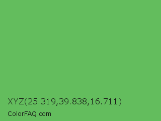 XYZ 25.319,39.838,16.711 Color is a normal green color and the nearest color is Fern #63b76c. Hex code #63bd5d and RGB value is rgb(99,189,93). In RGB color space, this color is composed of 39% red, 74% green, 36% blue, In CMYK color space, this color is composed of 48% cyan, 0% magenta, 51% yellow , 26% black , In HSL color space, this color has a hue angle of 116° , 42% saturation and 55% lightness.