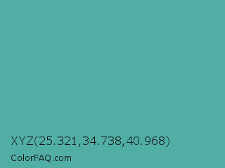 XYZ 25.321,34.738,40.968 Color is a normal cyan color and the nearest color is Tradewind #5fb3ac. Hex code #51aea5 and RGB value is rgb(81,174,165). In RGB color space, this color is composed of 32% red, 68% green, 65% blue, In CMYK color space, this color is composed of 53% cyan, 0% magenta, 5% yellow , 32% black , In HSL color space, this color has a hue angle of 174° , 36% saturation and 50% lightness.