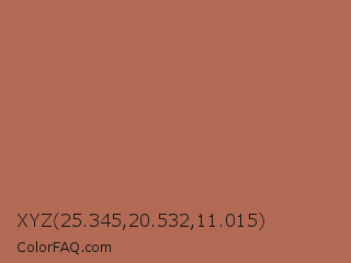 XYZ 25.345,20.532,11.015 Color is a normal red color and the nearest color is Santa Fe #b16d52. Hex code #b36a54 and RGB value is rgb(179,106,84). In RGB color space, this color is composed of 70% red, 42% green, 33% blue, In CMYK color space, this color is composed of 0% cyan, 41% magenta, 53% yellow , 30% black , In HSL color space, this color has a hue angle of 14° , 38% saturation and 52% lightness.