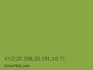 XYZ 25.358,33.191,10.7 Color is a normal lime color and the nearest color is Sushi #87ab39. Hex code #8ba645 and RGB value is rgb(139,166,69). In RGB color space, this color is composed of 55% red, 65% green, 27% blue, In CMYK color space, this color is composed of 16% cyan, 0% magenta, 58% yellow , 35% black , In HSL color space, this color has a hue angle of 77° , 41% saturation and 46% lightness.