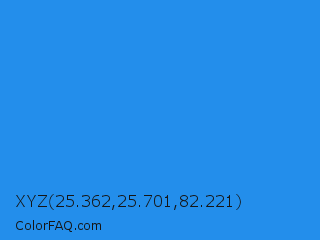 XYZ 25.362,25.701,82.221 Color is a normal blue color and the nearest color is Bleu De France #318ce7. Hex code #238eeb and RGB value is rgb(35,142,235). In RGB color space, this color is composed of 14% red, 56% green, 92% blue, In CMYK color space, this color is composed of 85% cyan, 40% magenta, 0% yellow , 8% black , In HSL color space, this color has a hue angle of 208° , 83% saturation and 53% lightness.