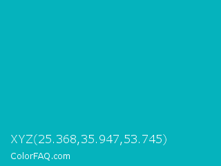 XYZ 25.368,35.947,53.745 Color is a normal cyan color and the nearest color is Tiffany Blue #0abab5. Hex code #05b3bd and RGB value is rgb(5,179,189). In RGB color space, this color is composed of 2% red, 70% green, 74% blue, In CMYK color space, this color is composed of 97% cyan, 5% magenta, 0% yellow , 26% black , In HSL color space, this color has a hue angle of 183° , 95% saturation and 38% lightness.