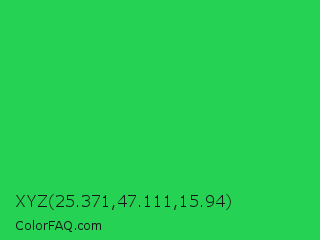 XYZ 25.371,47.111,15.94 Color is a normal green color and the nearest color is Malachite #0bda51. Hex code #25d253 and RGB value is rgb(37,210,83). In RGB color space, this color is composed of 15% red, 82% green, 33% blue, In CMYK color space, this color is composed of 82% cyan, 0% magenta, 60% yellow , 18% black , In HSL color space, this color has a hue angle of 136° , 70% saturation and 48% lightness.