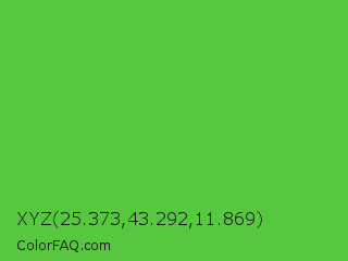XYZ 25.373,43.292,11.869 Color is a normal green color and the nearest color is Green RYB #66b032. Hex code #58c740 and RGB value is rgb(88,199,64). In RGB color space, this color is composed of 35% red, 78% green, 25% blue, In CMYK color space, this color is composed of 56% cyan, 0% magenta, 68% yellow , 22% black , In HSL color space, this color has a hue angle of 109° , 55% saturation and 52% lightness.