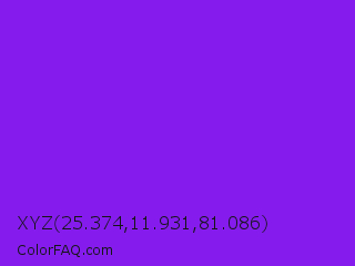 XYZ 25.374,11.931,81.086 Color is a normal violet color and the nearest color is Blue Violet #8a2be2. Hex code #851ced and RGB value is rgb(133,28,237). In RGB color space, this color is composed of 52% red, 11% green, 93% blue, In CMYK color space, this color is composed of 44% cyan, 88% magenta, 0% yellow , 7% black , In HSL color space, this color has a hue angle of 270° , 85% saturation and 52% lightness.