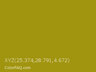 XYZ 25.374,28.791,4.672 Color is a normal yellow color and the nearest color is Dark Yellow #9b870c. Hex code #a1940f and RGB value is rgb(161,148,15). In RGB color space, this color is composed of 63% red, 58% green, 6% blue, In CMYK color space, this color is composed of 0% cyan, 8% magenta, 91% yellow , 37% black , In HSL color space, this color has a hue angle of 55° , 83% saturation and 35% lightness.