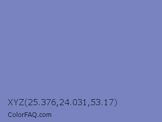 XYZ 25.376,24.031,53.17 Color is a light blue color and the nearest color is Ship Cove #788bba. Hex code #7883c0 and RGB value is rgb(120,131,192). In RGB color space, this color is composed of 47% red, 51% green, 75% blue, In CMYK color space, this color is composed of 38% cyan, 32% magenta, 0% yellow , 25% black , In HSL color space, this color has a hue angle of 231° , 36% saturation and 61% lightness.