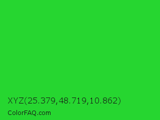 XYZ 25.379,48.719,10.862 Color is a normal green color and the nearest color is Lime Green #32cd32. Hex code #26d630 and RGB value is rgb(38,214,48). In RGB color space, this color is composed of 15% red, 84% green, 19% blue, In CMYK color space, this color is composed of 82% cyan, 0% magenta, 78% yellow , 16% black , In HSL color space, this color has a hue angle of 123° , 70% saturation and 49% lightness.