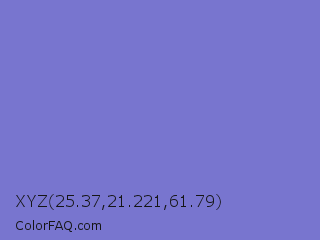 XYZ 25.37,21.221,61.79 Color is a light indigo color and the nearest color is Moody Blue #7f76d3. Hex code #7875cf and RGB value is rgb(120,117,207). In RGB color space, this color is composed of 47% red, 46% green, 81% blue, In CMYK color space, this color is composed of 42% cyan, 43% magenta, 0% yellow , 19% black , In HSL color space, this color has a hue angle of 242° , 48% saturation and 64% lightness.