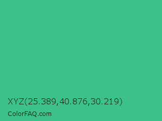 XYZ 25.389,40.876,30.219 Color is a normal green color and the nearest color is Mint #3eb489. Hex code #3bc189 and RGB value is rgb(59,193,137). In RGB color space, this color is composed of 23% red, 76% green, 54% blue, In CMYK color space, this color is composed of 69% cyan, 0% magenta, 29% yellow , 24% black , In HSL color space, this color has a hue angle of 155° , 53% saturation and 49% lightness.