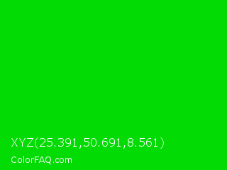 XYZ 25.391,50.691,8.561 Color is a normal green color and the nearest color is Green #00ff00. Hex code #03db04 and RGB value is rgb(3,219,4). In RGB color space, this color is composed of 1% red, 86% green, 2% blue, In CMYK color space, this color is composed of 99% cyan, 0% magenta, 98% yellow , 14% black , In HSL color space, this color has a hue angle of 120° , 97% saturation and 44% lightness.