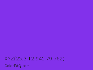 XYZ 25.3,12.941,79.762 Color is a normal violet color and the nearest color is Blue Violet #8a2be2. Hex code #8231eb and RGB value is rgb(130,49,235). In RGB color space, this color is composed of 51% red, 19% green, 92% blue, In CMYK color space, this color is composed of 45% cyan, 79% magenta, 0% yellow , 8% black , In HSL color space, this color has a hue angle of 266° , 82% saturation and 56% lightness.
