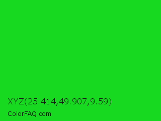 XYZ 25.414,49.907,9.59 Color is a normal green color and the nearest color is Vivid Malachite #00cc33. Hex code #17d91f and RGB value is rgb(23,217,31). In RGB color space, this color is composed of 9% red, 85% green, 12% blue, In CMYK color space, this color is composed of 89% cyan, 0% magenta, 86% yellow , 15% black , In HSL color space, this color has a hue angle of 122° , 81% saturation and 47% lightness.