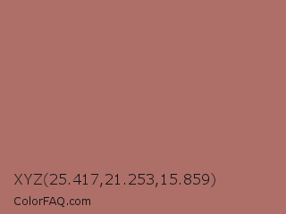 XYZ 25.417,21.253,15.859 Color is a normal red color and the nearest color is Copper Penny #ad6f69. Hex code #ad6f68 and RGB value is rgb(173,111,104). In RGB color space, this color is composed of 68% red, 44% green, 41% blue, In CMYK color space, this color is composed of 0% cyan, 36% magenta, 40% yellow , 32% black , In HSL color space, this color has a hue angle of 6° , 30% saturation and 54% lightness.
