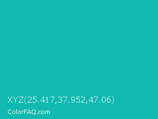 XYZ 25.417,37.952,47.06 Color is a normal cyan color and the nearest color is Tiffany Blue #0abab5. Hex code #11b9b0 and RGB value is rgb(17,185,176). In RGB color space, this color is composed of 7% red, 73% green, 69% blue, In CMYK color space, this color is composed of 91% cyan, 0% magenta, 5% yellow , 27% black , In HSL color space, this color has a hue angle of 177° , 83% saturation and 40% lightness.