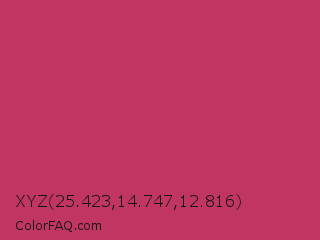 XYZ 25.423,14.747,12.816 Color is a normal rose color and the nearest color is Hibiscus #b6316c. Hex code #c13561 and RGB value is rgb(193,53,97). In RGB color space, this color is composed of 76% red, 21% green, 38% blue, In CMYK color space, this color is composed of 0% cyan, 73% magenta, 50% yellow , 24% black , In HSL color space, this color has a hue angle of 341° , 57% saturation and 48% lightness.