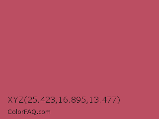 XYZ 25.423,16.895,13.477 Color is a normal red color and the nearest color is Popstar #be4f62. Hex code #bb4e62 and RGB value is rgb(187,78,98). In RGB color space, this color is composed of 73% red, 31% green, 38% blue, In CMYK color space, this color is composed of 0% cyan, 58% magenta, 48% yellow , 27% black , In HSL color space, this color has a hue angle of 349° , 44% saturation and 52% lightness.