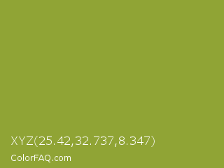 XYZ 25.42,32.737,8.347 Color is a normal lime color and the nearest color is Sushi #87ab39. Hex code #90a435 and RGB value is rgb(144,164,53). In RGB color space, this color is composed of 56% red, 64% green, 21% blue, In CMYK color space, this color is composed of 12% cyan, 0% magenta, 68% yellow , 36% black , In HSL color space, this color has a hue angle of 71° , 51% saturation and 43% lightness.