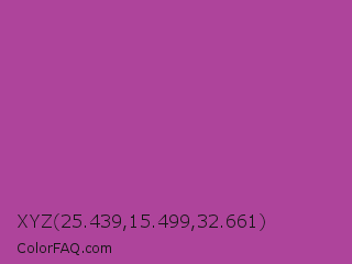 XYZ 25.439,15.499,32.661 Color is a normal magenta color and the nearest color is Byzantine #bd33a4. Hex code #ae449b and RGB value is rgb(174,68,155). In RGB color space, this color is composed of 68% red, 27% green, 61% blue, In CMYK color space, this color is composed of 0% cyan, 61% magenta, 11% yellow , 32% black , In HSL color space, this color has a hue angle of 311° , 44% saturation and 47% lightness.