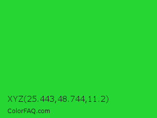 XYZ 25.443,48.744,11.2 Color is a normal green color and the nearest color is Lime Green #32cd32. Hex code #26d633 and RGB value is rgb(38,214,51). In RGB color space, this color is composed of 15% red, 84% green, 20% blue, In CMYK color space, this color is composed of 82% cyan, 0% magenta, 76% yellow , 16% black , In HSL color space, this color has a hue angle of 124° , 70% saturation and 49% lightness.