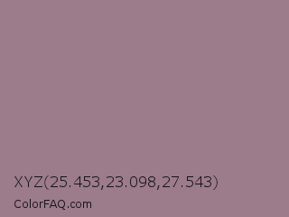 XYZ 25.453,23.098,27.543 Color is a normal rose color and the nearest color is Mountbatten Pink #997a8d. Hex code #9c7b8b and RGB value is rgb(156,123,139). In RGB color space, this color is composed of 61% red, 48% green, 55% blue, In CMYK color space, this color is composed of 0% cyan, 21% magenta, 11% yellow , 39% black , In HSL color space, this color has a hue angle of 331° , 14% saturation and 55% lightness.