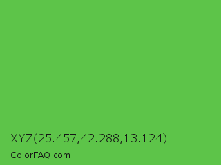 XYZ 25.457,42.288,13.124 Color is a normal green color and the nearest color is Green RYB #66b032. Hex code #5dc449 and RGB value is rgb(93,196,73). In RGB color space, this color is composed of 36% red, 77% green, 29% blue, In CMYK color space, this color is composed of 53% cyan, 0% magenta, 63% yellow , 23% black , In HSL color space, this color has a hue angle of 110° , 51% saturation and 53% lightness.