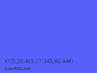XYZ 25.463,17.343,92.448 Color is a light blue color and the nearest color is Very Light Blue #6666ff. Hex code #5860fa and RGB value is rgb(88,96,250). In RGB color space, this color is composed of 35% red, 38% green, 98% blue, In CMYK color space, this color is composed of 65% cyan, 62% magenta, 0% yellow , 2% black , In HSL color space, this color has a hue angle of 237° , 94% saturation and 66% lightness.