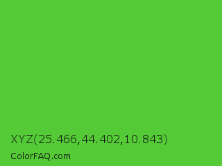 XYZ 25.466,44.402,10.843 Color is a normal green color and the nearest color is Green RYB #66b032. Hex code #54ca37 and RGB value is rgb(84,202,55). In RGB color space, this color is composed of 33% red, 79% green, 22% blue, In CMYK color space, this color is composed of 58% cyan, 0% magenta, 73% yellow , 21% black , In HSL color space, this color has a hue angle of 108° , 58% saturation and 50% lightness.