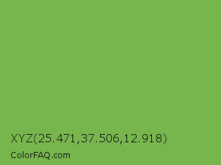 XYZ 25.471,37.506,12.918 Color is a normal green color and the nearest color is Bud Green #7bb661. Hex code #77b54d and RGB value is rgb(119,181,77). In RGB color space, this color is composed of 47% red, 71% green, 30% blue, In CMYK color space, this color is composed of 34% cyan, 0% magenta, 57% yellow , 29% black , In HSL color space, this color has a hue angle of 96° , 41% saturation and 51% lightness.