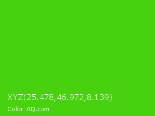 XYZ 25.478,46.972,8.139 Color is a normal green color and the nearest color is Harlequin Green #46cb18. Hex code #47d10e and RGB value is rgb(71,209,14). In RGB color space, this color is composed of 28% red, 82% green, 5% blue, In CMYK color space, this color is composed of 66% cyan, 0% magenta, 93% yellow , 18% black , In HSL color space, this color has a hue angle of 102° , 87% saturation and 44% lightness.