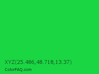 XYZ 25.486,48.718,13.37 Color is a normal green color and the nearest color is Malachite #0bda51. Hex code #1ad643 and RGB value is rgb(26,214,67). In RGB color space, this color is composed of 10% red, 84% green, 26% blue, In CMYK color space, this color is composed of 88% cyan, 0% magenta, 69% yellow , 16% black , In HSL color space, this color has a hue angle of 133° , 78% saturation and 47% lightness.