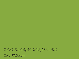 XYZ 25.48,34.647,10.195 Color is a normal green color and the nearest color is Sushi #87ab39. Hex code #87ab40 and RGB value is rgb(135,171,64). In RGB color space, this color is composed of 53% red, 67% green, 25% blue, In CMYK color space, this color is composed of 21% cyan, 0% magenta, 63% yellow , 33% black , In HSL color space, this color has a hue angle of 80° , 46% saturation and 46% lightness.