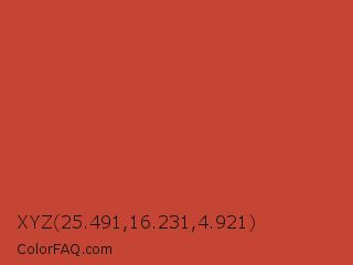 XYZ 25.491,16.231,4.921 Color is a normal red color and the nearest color is Mojo #c04737. Hex code #c44533 and RGB value is rgb(196,69,51). In RGB color space, this color is composed of 77% red, 27% green, 20% blue, In CMYK color space, this color is composed of 0% cyan, 65% magenta, 74% yellow , 23% black , In HSL color space, this color has a hue angle of 7° , 59% saturation and 48% lightness.