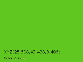 XYZ 25.508,43.438,8.406 Color is a normal green color and the nearest color is Kelly Green #4cbb17. Hex code #60c720 and RGB value is rgb(96,199,32). In RGB color space, this color is composed of 38% red, 78% green, 13% blue, In CMYK color space, this color is composed of 52% cyan, 0% magenta, 84% yellow , 22% black , In HSL color space, this color has a hue angle of 97° , 72% saturation and 45% lightness.