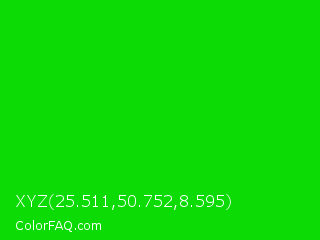 XYZ 25.511,50.752,8.595 Color is a normal green color and the nearest color is Green #00ff00. Hex code #0cdb05 and RGB value is rgb(12,219,5). In RGB color space, this color is composed of 5% red, 86% green, 2% blue, In CMYK color space, this color is composed of 95% cyan, 0% magenta, 98% yellow , 14% black , In HSL color space, this color has a hue angle of 118° , 96% saturation and 44% lightness.