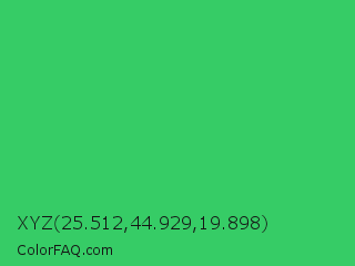 XYZ 25.512,44.929,19.898 Color is a normal green color and the nearest color is UFO Green #3cd070. Hex code #36cc66 and RGB value is rgb(54,204,102). In RGB color space, this color is composed of 21% red, 80% green, 40% blue, In CMYK color space, this color is composed of 74% cyan, 0% magenta, 50% yellow , 20% black , In HSL color space, this color has a hue angle of 139° , 60% saturation and 51% lightness.