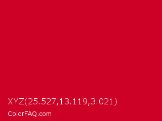 XYZ 25.527,13.119,3.021 Color is a normal red color and the nearest color is Monza #c7031e. Hex code #cd0026 and RGB value is rgb(205,0,38). In RGB color space, this color is composed of 80% red, 0% green, 15% blue, In CMYK color space, this color is composed of 0% cyan, 100% magenta, 81% yellow , 20% black , In HSL color space, this color has a hue angle of 349° , 100% saturation and 40% lightness.