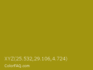 XYZ 25.532,29.106,4.724 Color is a normal yellow color and the nearest color is Dark Yellow #9b870c. Hex code #a1950f and RGB value is rgb(161,149,15). In RGB color space, this color is composed of 63% red, 58% green, 6% blue, In CMYK color space, this color is composed of 0% cyan, 7% magenta, 91% yellow , 37% black , In HSL color space, this color has a hue angle of 55° , 83% saturation and 35% lightness.