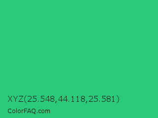 XYZ 25.548,44.118,25.581 Color is a normal green color and the nearest color is UFO Green #3cd070. Hex code #29ca7a and RGB value is rgb(41,202,122). In RGB color space, this color is composed of 16% red, 79% green, 48% blue, In CMYK color space, this color is composed of 80% cyan, 0% magenta, 40% yellow , 21% black , In HSL color space, this color has a hue angle of 150° , 66% saturation and 48% lightness.