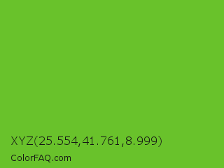 XYZ 25.554,41.761,8.999 Color is a normal green color and the nearest color is Green RYB #66b032. Hex code #69c22b and RGB value is rgb(105,194,43). In RGB color space, this color is composed of 41% red, 76% green, 17% blue, In CMYK color space, this color is composed of 46% cyan, 0% magenta, 78% yellow , 24% black , In HSL color space, this color has a hue angle of 95° , 64% saturation and 46% lightness.